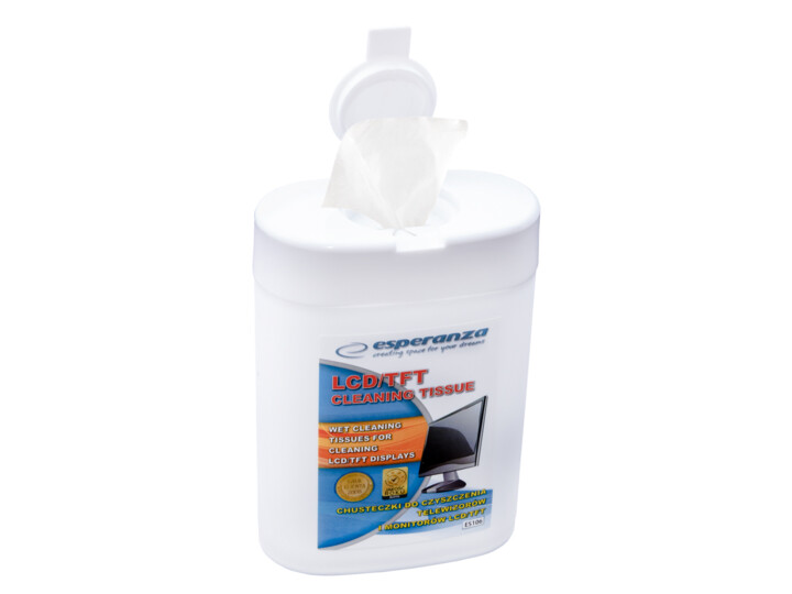Wilgotne chusteczki czyszczące firmy Esperanza przeznaczone są do pielęgnacji monitorów LCD/TFT, ekranów laptopów, palmtopów, odbiorników telewizyjnych I innych urządzeń wyposażonych w tego typu matryce. Usuwają nawet uciążliwy brud. Antystatyczne i antybakteryjne. Nie pozostawiają smug. Nie zawierają alkoholu.