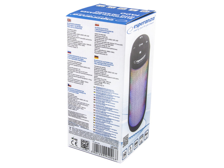 Esperanza FADO to głośnik Bluetooth, dzięki któremu można słuchać muzyki bezprzewodowo, bezpośrednio z pamięci USB Flash drive lub przy użyciu karty TF (microSD).