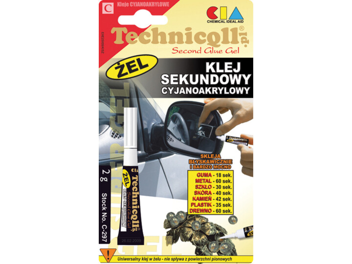 Jednoskładnikowy, bezbarwny o konsystencji żelu klej na bazie cyjanoakrylanu etylu o najwyższych parametrach kleju technicznego,