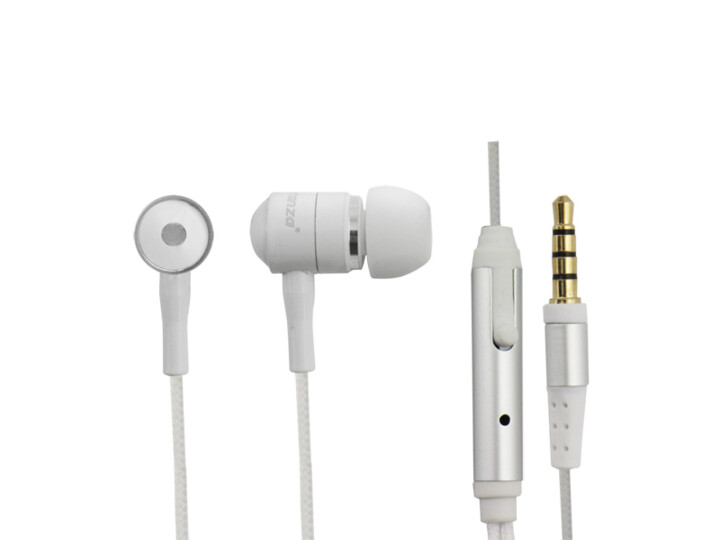 Przewodowe, metalowe, dokanałowe słuchawki z mikrofonem. Kabel słuchawek został pokryty materiałem zabezpieczającym kabel przed uszkodzeniem.