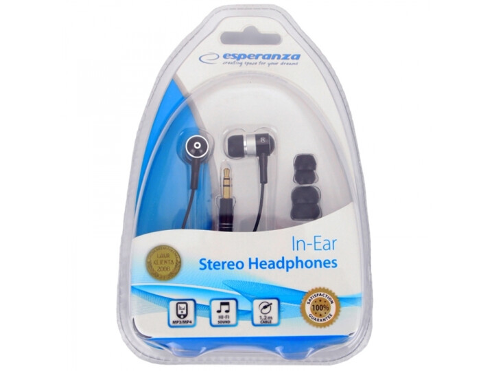 Wysokiej jakości słuchawki stereo, douszne, kanałowe do odtwarzaczy audio, MP3/MP4, komputerów i innych urządzeń posiadających standardowe wyjście audio. Wyposażone zostały w trwałe, łatwo dopasowujące się do kształtu ucha, tłumiące zewnętrzne hałasy wkładki gumowe. Dodatkowo posiadają wzmocniony efekt odtwarzania basów oraz metalowe wstawki poprawiające jakość odtwarzanego dźwięku oraz trwałość słuchawek. Posiadają specjalnie wyprofilowany kształt, który zapewnia doskonały, czysty i dynamiczny dźwięk w całym zakresie częstotliwości. W komplecie 2 zapasowe nakładki gumowe różnych rozmiarów. Kolor czarno - srebrny