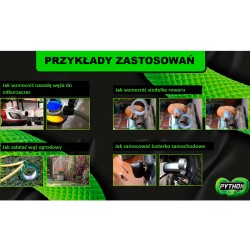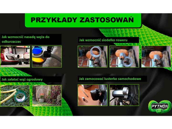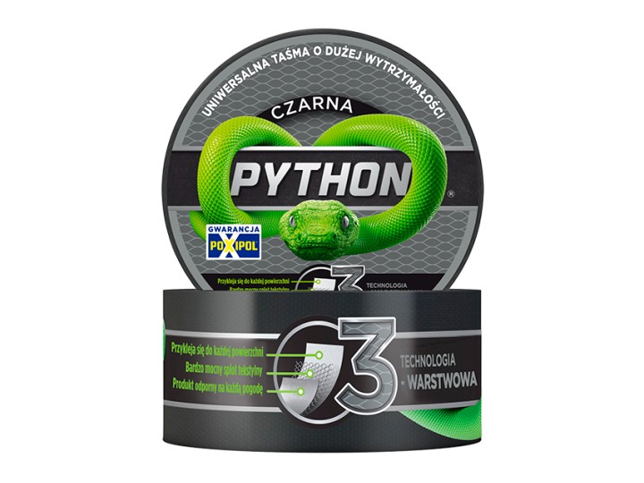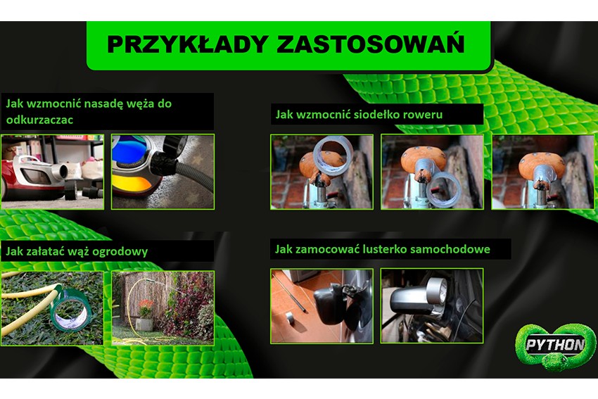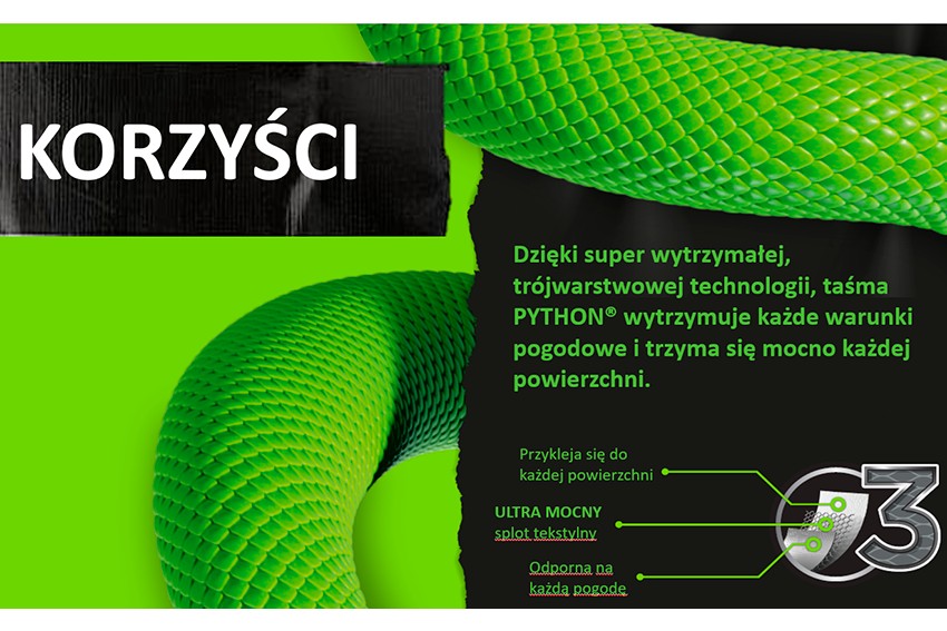 Wyjątkowa wytrzymałość – PYTHON to taśma o solidnym, grubym splocie tekstylnym, która zapewnia niezrównaną odporność na rozerwanie i ścieranie. Dzięki temu doskonale nadaje się do wzmacniania, naprawiania i mocowania różnorodnych przedmiotów.