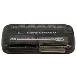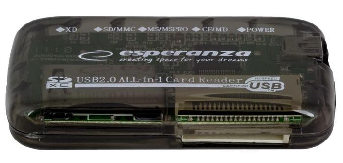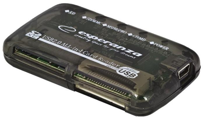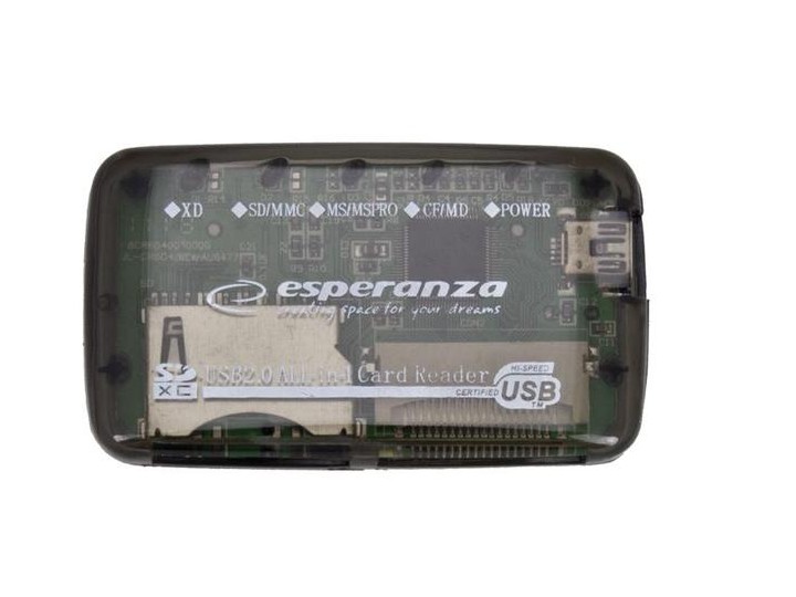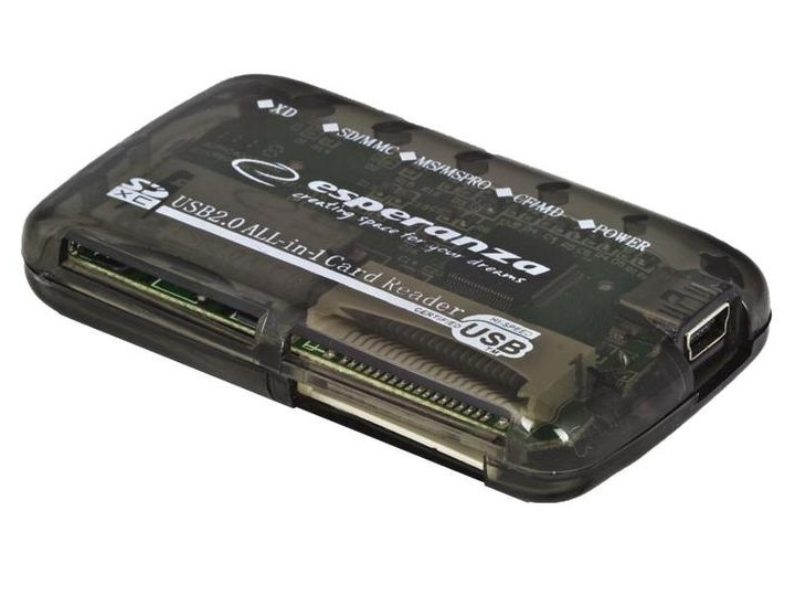 Uniwersalny, zewnętrzny czytnik kart pamięci. Umożliwia wczytywanie danych i zdjęć do komputerów stacjonarnych i notebooków. Współpracuje z większością popularnych kart pamięci. Nie wymaga sterowników. Lekki i wygodny w przenoszeniu